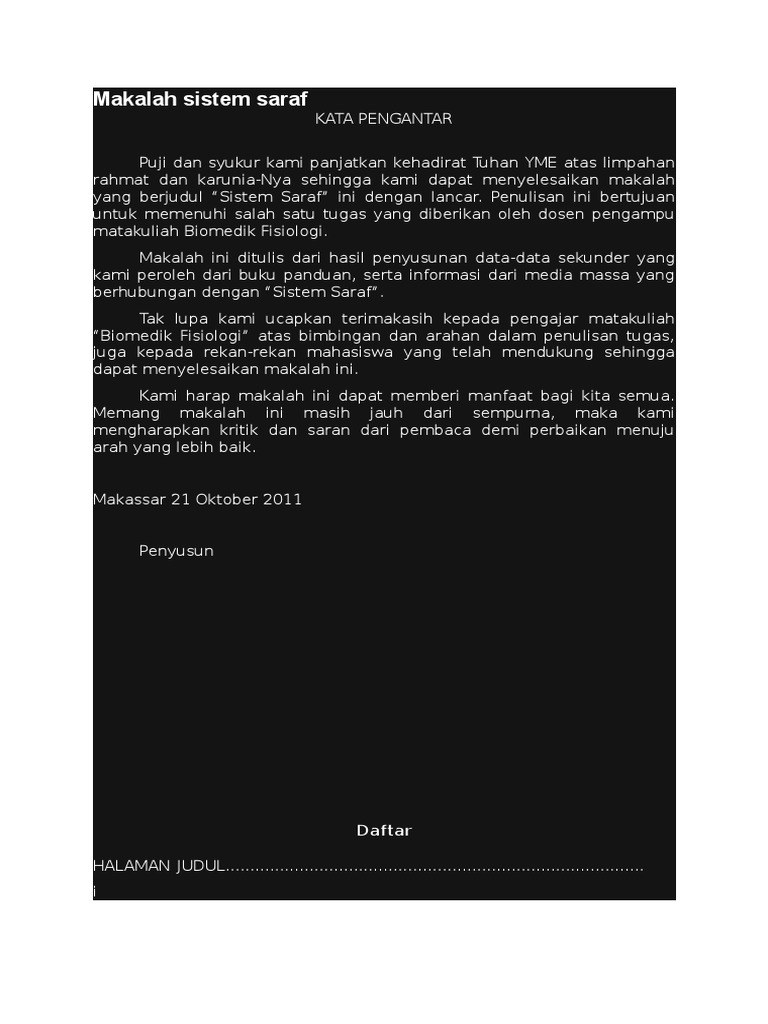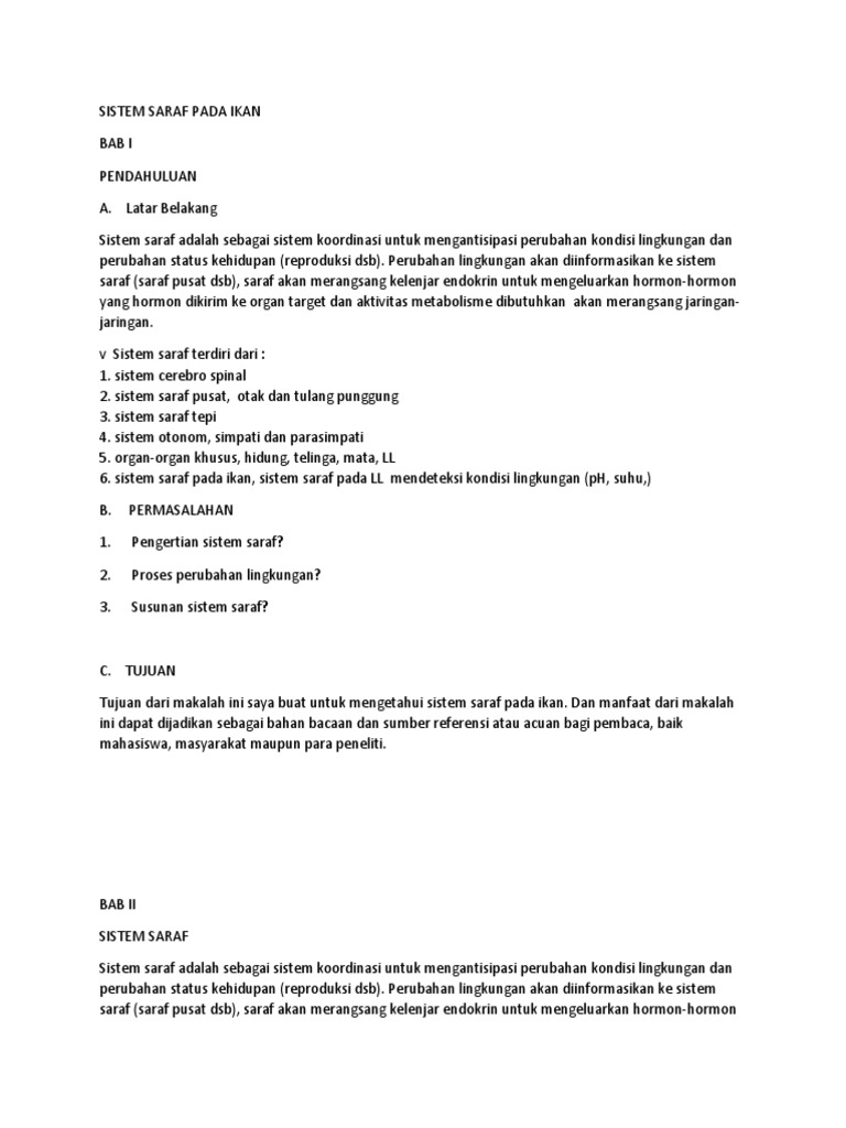 Makalah Sistem Saraf Edit Doc Doc Document from demo.fdokumen.com Sistem saraf adalah salah satu sistem koordinasi yang berfungsi untuk menyampaikan rangsangan dari reseptor yang akan dideteksi dan direspon oleh tubuh. Sistem saraf merupakan salah satu sistem koordinasi yang bertugas menyampaikan rangsangan dari reseptor untuk dideteksi dan direspon oleh tubuh. 160110150155 ellania ramadhani 160110150156 jeahani trisya oktawati 160110150157 ifrialda fatwa f. Melva silitonga, m.s adapun makalah ini berisi 3 bab yakni bab 1 berupa pendahuluan dari pembuatan makalah, bab 2 berupa pembahasan dari sistem saraf yakni pengertian, pembagian, fungsi sistem saraf, unit stuktural sistem saraf (neuron) dan mekanisme penjalaran impuls pada sistem saraf, dan bab 3 yang berisi kesimpulan berupa ringkasan dari makalah ini. Sistem ini memungkinkan kita untuk berkomunikasi dengan dunia luar dan terdiri dari dua komponen, sistem saraf pusat (ssp) dan sistem saraf perifer (pns). Saraf otak ada 12 pasang yang terdiri dari: Pengetahuan tentang anatomi dan fisiologi sistem reproduksi pada manusia merupakan ilmu yang paling dasar bagi setiap pelaku kesehatan reproduksi khususnya para wanita. Daya kepaan dan daya hantaran merupakan sifat utam dari mahkluk hidup dalam bereaksi terhadap perubahan sekitarnya.